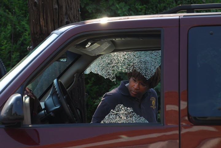 Pittsburgh Police crime unit Detective Charlotte Hughes looks at the passenger side of a mini van parked at the corner of Margaret St. and Hayes Ave. in Mt. Oliver that was involved in an earlier shooting on Mountain Ave. in Pittsburgh on Thursday, July 17, 2008.