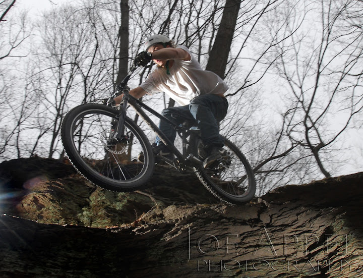 I was walking through Frick Park the other day when I came across Max Loewenstein jumping his mountain bike off of the cliffs above Tranquility Trail.