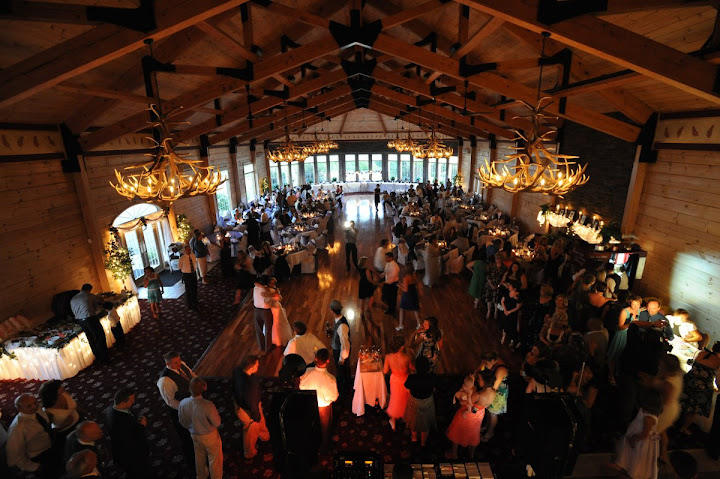Check out the antler chandeliers and the log cabin walls!